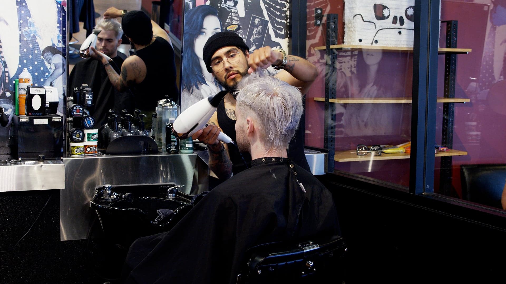 Fern The Barber and Sammie Saunders, Technical Education Manager at Floyd's, teamed up on Spencer’s blow-cut mullet and pushed creativity with a zig-zag platinum card technique, sectioning hair in the zig-zag section into foil to obtain lift. Really personalizing the cut and color like a pro. To keep the style defined, they finished with Tea Tree Shaping Cream, great for separation, and makes fine hair multiply and stay groomed for your day.