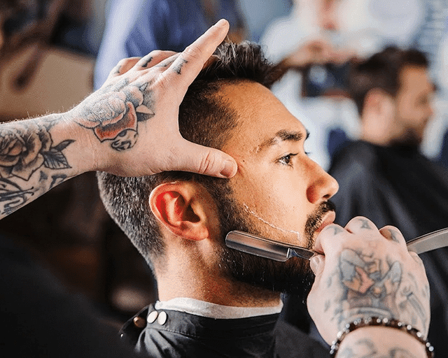 Enhanced beard service by a barber and with a straight razor.